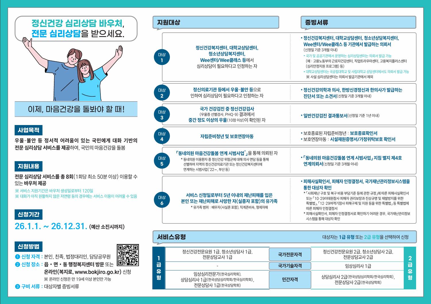 26년도에도 작년과 같이 8회기의 심리상담을 받을 수 있는 [정신건강 심리상담 바우처] 접수가 시작되었습니다.
